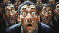 Deze spookachtige scène toont een menigte mensen die in de greep is van angst en paniek. De gezichten van de mensen zijn vol angst, met wijd opengesperde ogen en opengesperde monden, alsof ze op de vlucht zijn voor een onbekend gevaar. De houdingen van de mensen suggereren chaos en wanhoop terwijl ze in verschillende richtingen kijken, onzeker over waar ze heen moeten. De gespannen sfeer is voelbaar en geeft een gevoel van dreiging. Deze afbeelding kan symbool staan voor een emotionele reactie op een ramp of onverwachte gebeurtenis en belichaamt de menselijke reactie op extreme stressvolle situaties.