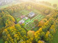 Uitzicht op de Menkemaborg en het borgterrein in herfstkleuren. Deze borg staat in Uithuizen in de provincie Groningen. De foto is genomen op de vroege ochtend tijdens zonsopkomst.