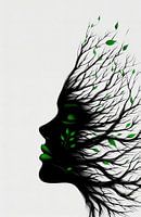 Het profiel van het gezicht van een vrouw, geleidelijk gaat dit over in een boom, samen het symbool van de natuur. Het beeld is met behulp van ai gegenereerd en is mijn beeld van moeder natuur.