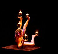 Foto in kleur van een vrouw die kandelaren met brandende kaarsen vasthoudt met haar handen en voeten in reflectie met zwarte achtergrond