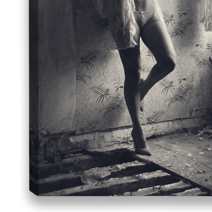 Een foto van een model in een vervallen en verlaten klooster.