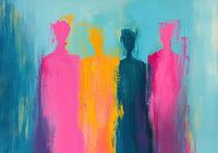 Mensen Silhouetten - Op dit abstract schilderij zie je silhouetten van vier mensen in opvallende kleuren zoals roze, geel en blauw, die samen een gevoel van samenhang en dynamiek uitstralen.