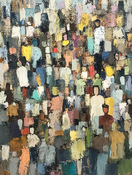 Mensen abstract - Op dit abstracte schilderij zie je een grote groep mensen in verschillende kleuren, met herkenbare figuren die in vage vormen door elkaar staan, wat een levendige en dynamische uitstraling geeft.