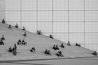De trappen van de Grande Arche in Parijs zijn een plek waar architectuur en stedelijk leven elkaar ontmoeten. In deze meervoudige opnamen in zwart-wit worden zowel de monumentale lijnen van het gebouw als de mensen die op de trappen rondhangen vastgelegd.