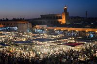 Mensen en voedselkraampjes 's avonds op Jema el Fna in Marrakech Marokko