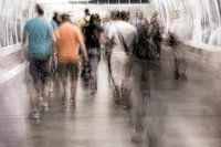 Deze foto is in de metro van Tsjechië gemaakt. doordat het beeld vaag is suggereert het snelheid. De mensen haasten zich om naar huis of werk te gaan.