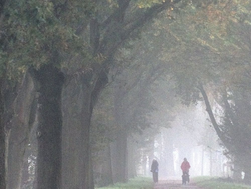 Wandelaars in de herfstmist in Gelsenkirchen-Buer