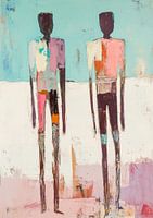 Mensen in verschillende kleuren - In dit abstract schilderij zie je twee gestileerde mensenfiguren met opvallende kleuren, zoals roze en oranje, tegen een rustige blauwe achtergrond.