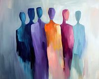 Mensen kleuren - Op dit abstract schilderij zie je een groep mensen gevormd in zachte, vloeiende kleuren zoals blauw, paars, oranje en roze, wat een gevoel van samenhorigheid en verbinding oproept.