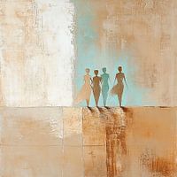 Mensfiguren | Timeless Stroll - Dit moderne schilderij toont drie gestileerde menselijke figuren die over een abstract landschap lopen, in aardetinten met blauwe accenten.