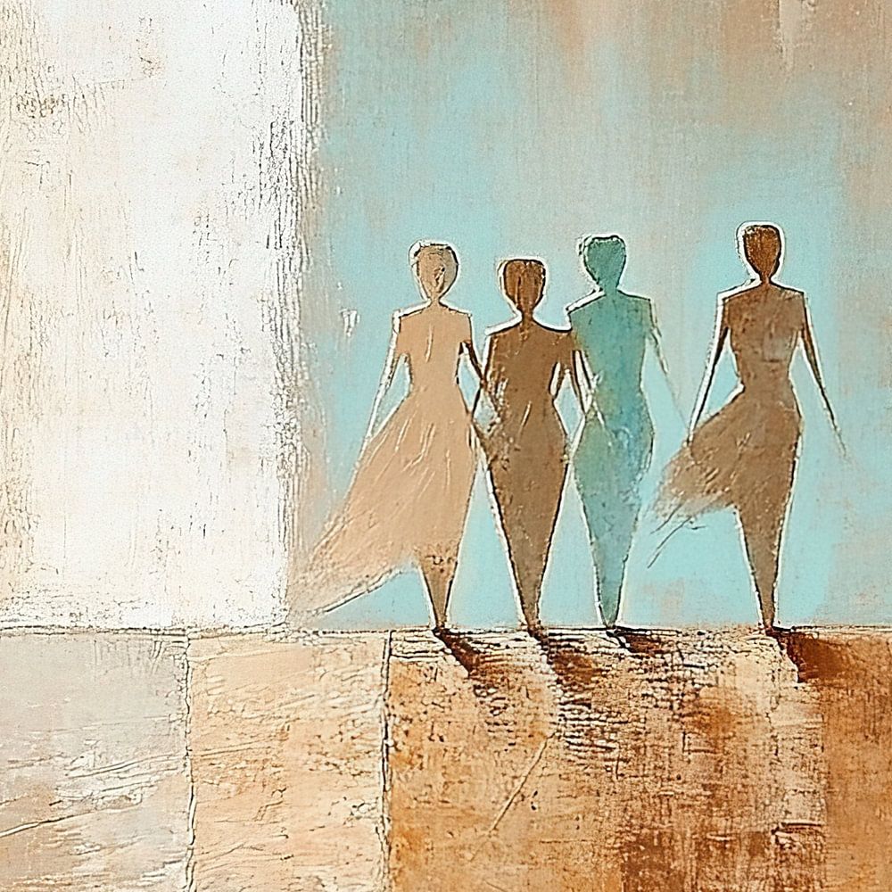 Mensfiguren | Timeless Stroll - Dit moderne schilderij toont drie gestileerde menselijke figuren die over een abstract landschap lopen, in aardetinten met blauwe accenten.