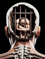 Dit opvallende surrealistische kunstwerk toont een menselijke figuur gevangen in een schedel - symbool voor de gevangenis van de geest. Het drukt visueel de pijn uit van overdenken, angst, depressie en de onzichtbare kooien die door onze eigen gedachten worden gebouwd.