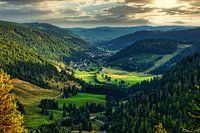 Avondstemming in de Menzenschwander vallei, uitzicht op het Hinterdorf, Menzenschwand, Zwarte Woud, Baden-Württemberg, Duitsland, Prachtig panorama in het Zwarte Woud op dromerige natuur.