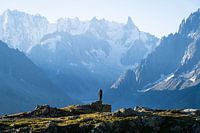 Een vrouw kijkt richting gletsjer 'Mer de Glace' uit op de spitse bergtoppen boven Chamonix.