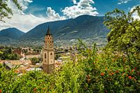 Gezicht op de oude stad Merano met op de voorgrond de parochiekerk van St. Nicolaas