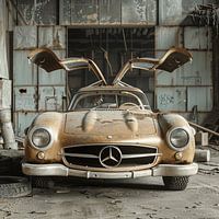 Op deze foto staat een legendarische Mercedes-Benz 300SL met zijn karakteristieke vleugeldeuren geparkeerd in een verlaten werkplaats. Het patina van de rode lak, getekend door stof en tijd, geeft het voertuig een bijzondere esthetiek. Ondanks de verweerde staat straalt de klassieker tijdloze elegantie en sportiviteit uit. De open hal…