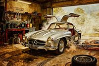 Ik heb licht en schaduw gebruikt om de scène vorm te geven, door het zonlicht door het raam te laten schijnen om de zilveren rondingen van de 300 SL te kussen. De schilderachtige textuur is opzettelijk bedoeld om een gevoel van nostalgie op te roepen, een droomachtige kwaliteit. Dit vintage garageschilderij is mijn eerbetoon aan een tijdperk van design en techniek. Elke penseelstreek is bedoeld om de geest van deze klassieke autokunst te vieren en de rauwe kracht en tijdloze elegantie vast te leggen die de Mercedes 300 SL Gullwing belichaamt. Het is een gedeelde herinnering aan passie, een bewijs van de blijvende liefde voor mooie machines, een rustig moment van bewondering in een heilige ruimte.