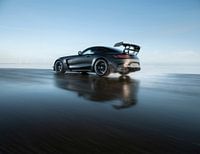 Speeding Mercedes-AMG GT Black Series on the road at sea in a beautiful sunset. Reflecting the massive amount of AMG power in the wet asphalt of the most extreme edition of the AMG GT roadcar, the 720 hp strong Black Series.