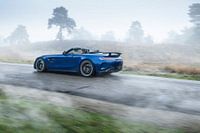 The Mercedes-AMG GTR Cabriolet with a roaring V8 speeding through a foggy valley.