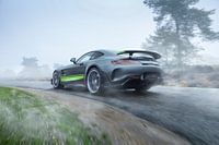 The Mercedes-AMG GTR PRO racing and cutting corners on a foggy racetrack.
