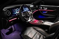 Een strak modern interieur van de Mercedes E63.S AMG met blauwe en roze ledverlichting