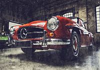 Een prachtig werk van een Mercedes Benz 190SL (schildering). Ik maak mijn werken allemaal zelf en maak geen gebruik van AI programma's (kunstmatige intelligentie). Elk detail wordt door mijzelf aangebracht. Daarom kan ik soms wel uren bezig zijn om een bepaald beeld te creëren.
