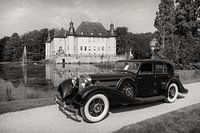Mercedes Benz 540K W29 klassieke auto voor het slot Dyck in Duitsland. Zwart wit foto.