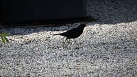 Een zwarte merel loopt over licht grind, gevangen in een scherpe strook zonlicht. Minimalistisch en rustig, met sterk contrast—een subtiele natuurprint die elke ruimte verfijnt, thuis of kantoor.