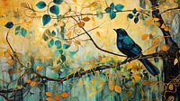 Kleurrijk werk in art nouveau stijl met een merel in het bos. De zwarte vogel zit op een tak tussen de bladeren, een lichte plek met zonlicht in de verte.