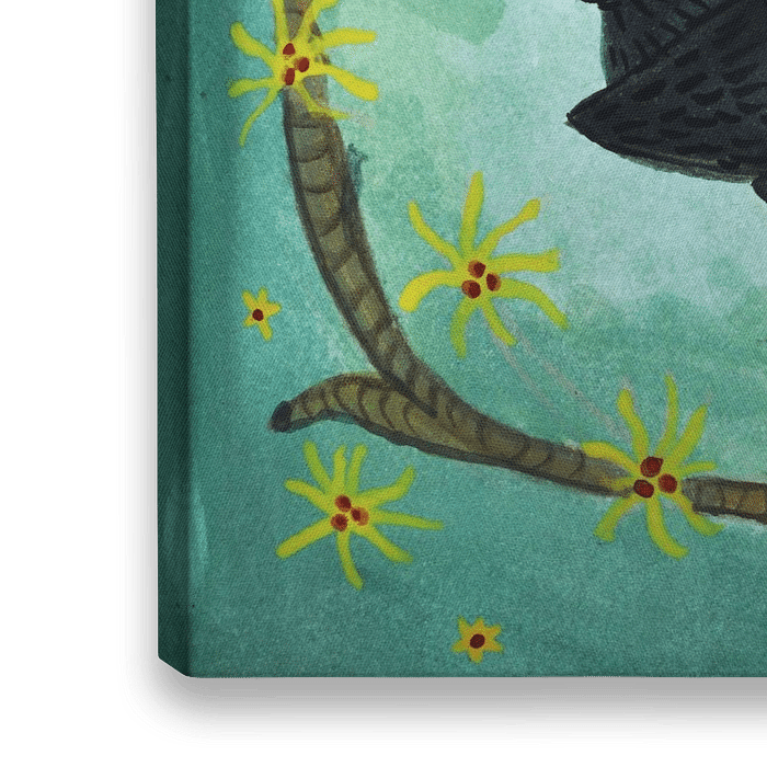 Koop dit bloemen kunstwerk Merel met Toverhazelaar | Vrolijke Voorjaars Bloesem met zwarteVogel van Anita Letuve op canvas, aluminium dibond, (ingelijste) fotoprint, behang en ArtFrame, op maat geprint in Fine-Art kwaliteit.