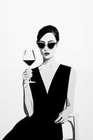Een vrouw gekleed in een avondjurk houdt elegant een glas wijn vast. De zwarte en witte contrasten zijn versterkt door het subtiele gebruik van schaduwen, waardoor de afbeelding diepte krijgt. Dit kunstwerk past prachtig in een stedelijk appartement of als onderdeel van een verfijnde galerijwand.