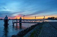 Een steiger langs de kade van de rivier de Merwede ter hoogte van Gorinchem of Gorkum. In de verte de contouren van de karakteristieke bogen van de Merwedebrug. De zon is al een tijdje onder water en de duisternis staat op het punt in te vallen. Nog even licht de horizon oranje rood op.Mer