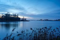 de rivier de Merwede ter hoogte van Gorinchem en Sleeuwijk. Links een gedeelte van het natuurgebied de Groesplaat en in de verte de contouren van de Merwedebrug. De zon is onder gegaan en de avond valt.