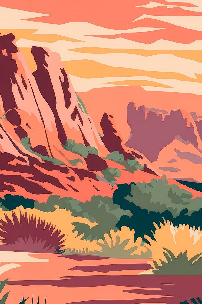 Een adembenemende zonsondergang omlijst door majestueuze rode rotsen en een zachte, heldere lucht voert de kijker mee naar de wildernis van Arizona. De zachte kleuren en gestileerde vormen geven het kunstwerk een nostalgische charme die perfect past in een woonkamer. Ideaal om een ontspannen sfeer te creëren die een gevoel van avontuur opwekt en gesprekken stimuleert.