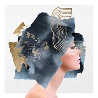 Portret van een vrouw, gecombineerd met abstracte vormen in gouden en blauwe kleuren.