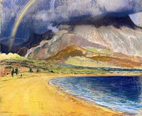 Deze kustlijn in dit landschap is opgebouwd uit geel zand, dus een strand, met links een regenboog, dus zon en regen uit de dreigende wolken ronde de berg op de achtergrond.