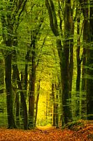 Met bladeren bedekt pad door een beukenbos in het Speulderbos in het Veluwse natuurreservaat.