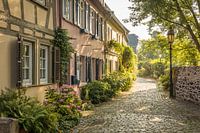 Met bloemen omzoomde oude stadsstraat in Frankfurt-Höchst, Frankfurt, Hessen, Duitsland