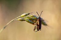 een motvlinder bedekt met dauwdruppels. Dit insect kan pas gaan vliegen wanneer het is opgedroogd in de zon.