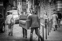 straatfoto van mannen in strak pak met een zetel door de straten van Bordeaux