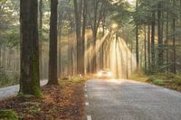 Het was een prachtige ochtend in de vroege herfst. De zon prikte door de lichte nevel waardoor prachtige zonnestralen ontstonden. In de verte hoorde ik een auto aankomen rijden. Even gewacht met de foto te nemen tot deze de bocht om kwam.