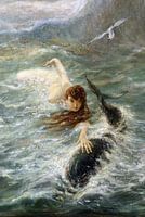 Deze meermin of zeemeermin speelt met plezier met een dolfijn in zee. Boven de meid vliegt een zeemeeuw.