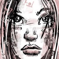 Stoer portret van een jonge vrouw met een zelfverzekerde blik in haar ogen, Met deze dame valt niet te spotten. Het kunstwerk is gemaakt met roze tinten in combinatie met wit en zwart.