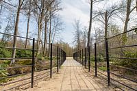 Pad met nieuwe metalen brug over bosbeek in natuur. Deze foto heb ik in het voorjaar gemaakt in het Twickelse bos in Twente Overijssel in Nederland. Er loopt een zandpad of wandelpad over het bruggetje dat leidt naar het park.