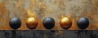 Metallic Ballen - Dit abstracte stilleven schilderij toont vier elegante sferen, geordend van links naar rechts, afwisselend in matzwart en glanzend goud, tegen een rich textuurschilderij achtergrond in schakeringen van goud en umber.