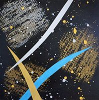 Handgemaakt schilderij origineel met acrylverf op canvasdoek in de kleuren goud zilver en blauw op een zwarte achtergrond