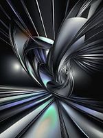 Dit werk toont een abstracte, vloeiende dans van licht en schaduw, waarin metallic vormen door een ruimte van verschillende kleuren lijken te zweven. De glinsterende, gedraaide lijnen en vormen roepen een gevoel van beweging op en geven het werk een futuristische en dynamische uitstraling.