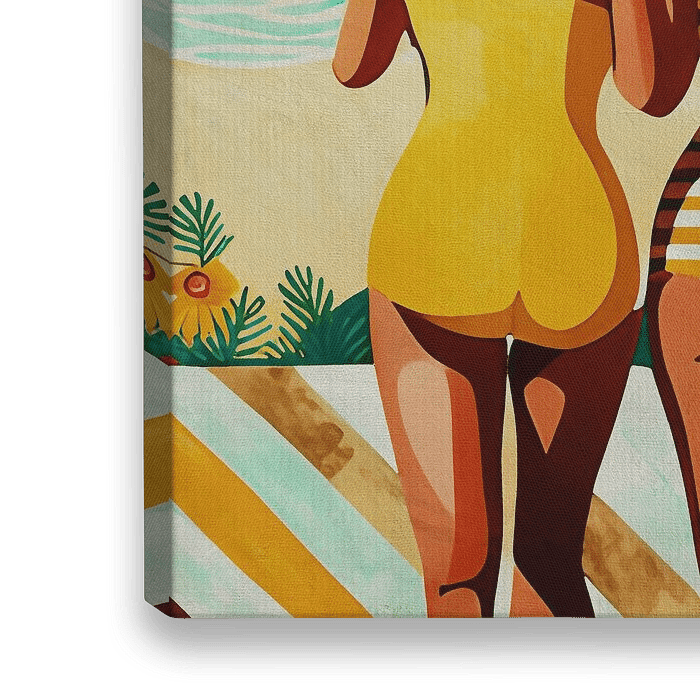 Dit schilderij van Jan Keteleer legt op meesterlijke wijze een moment van stille gemeenschap vast tussen twee vrouwen op het strand, starend naar de uitgestrekte zee. Ze zijn gekleed in badpakken uit de jaren 1950 en staan bij de balustrade van een zeewering. Ze belichamen de mode van die tijd met elegantie en gratie. De zorgvuldige montage van de digitale creatie op een houten paneel voegt een tastbare warmte toe en nodigt de toeschouwer uit in een vervlogen tijdperk. Keteleer's gebruik van een retro-esthetiek geeft het kunstwerk niet alleen een gevoel van nostalgie naar voorbije zomers, maar onderstreept ook op subtiele wijze de blijvende vriendschap tussen de vrouwen. De sfeer van het schilderij is geladen met een onuitgesproken begrip en gedeelde herinneringen, waardoor het een aangrijpend eerbetoon is aan de tijdloze en troostende essentie van kameraadschap.