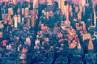 Manhattan full screen - op de voorgrond zie je Lower Manhattan en verder naar achteren de wolkenkrabbers van Midtown. Vlak voor zonsondergang tekenen de schaduwen extra patronen in het stadslandschap.