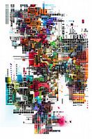 Binnen de collage zijn er verschillende geometrische vormen te onderscheiden, waaronder vierkanten, rechthoeken en lijnen, die samen een ritmisch en bijna muzikaal patroon creëren. De combinatie van pixelachtige structuren en vloeiende overgangen tussen kleuren en vormen geeft het werk een moderne, digitale esthetiek.